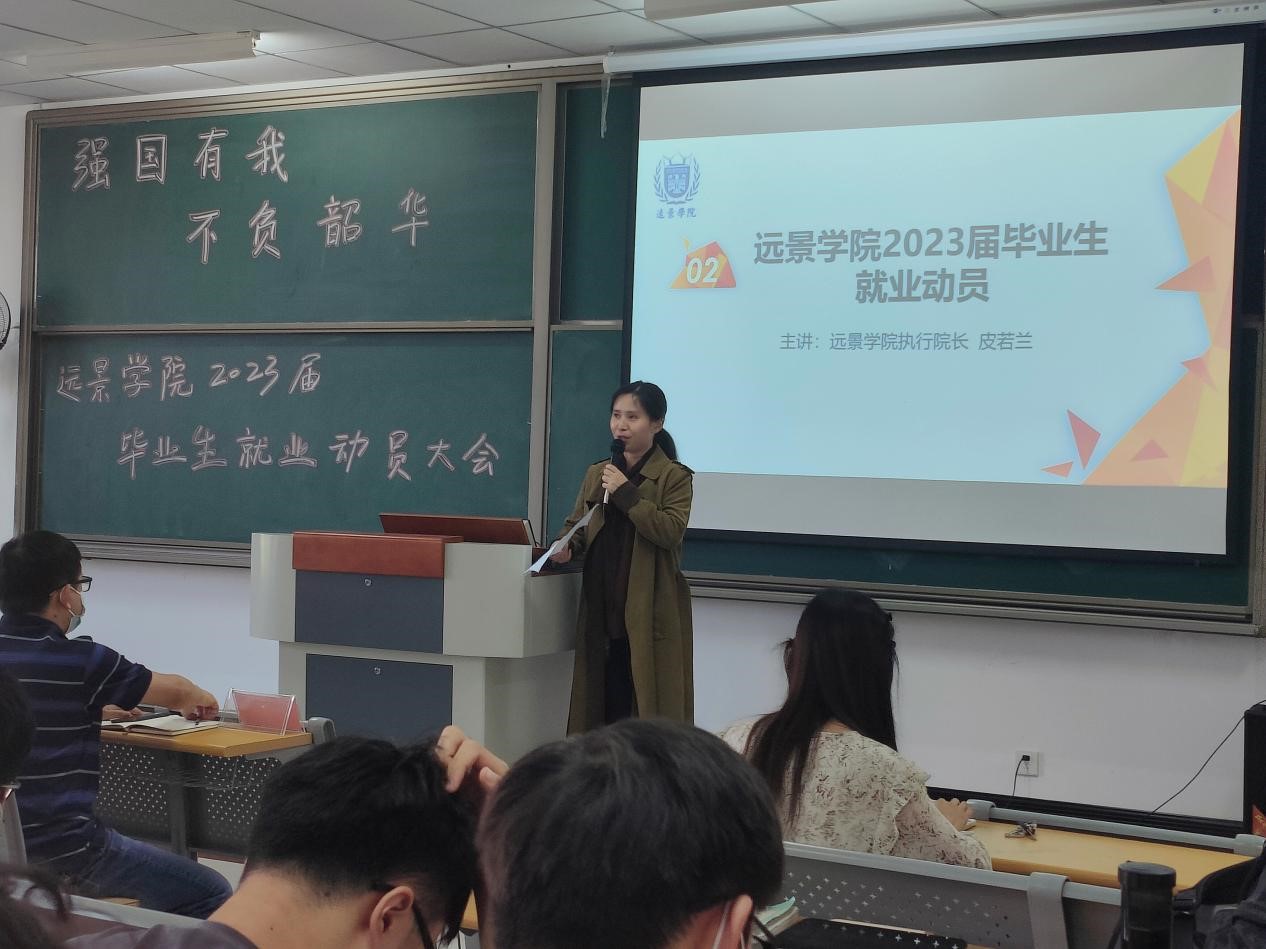 远景学院执行院长皮若兰进行了就业动员,皮院长讲到:远景的特色培养模式下,让大家的综合素养有了很大的提升,同学们首先要有自信心面对就业,鼓励同学们直面困难、学会独立,承担好个人和家庭的责任,她相信2023届毕业生也都做好充分就业准备,并对同学们充满信心。最后希望同学们能基于内心职业理想,能够遵循内心热爱,考虑长远,保持自己的节奏并坚持下去,创造属于自己的价值,活在当下而脚踏实地。