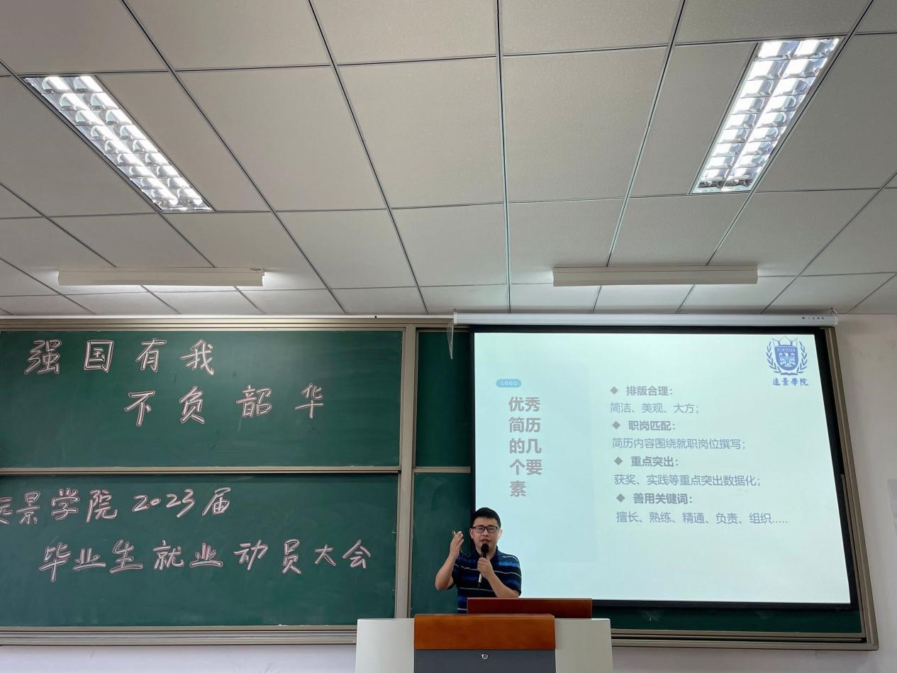 辅导员杨斌誉老师对远景学院2023届毕业生情况作简单介绍,客观分析了目前远景学院2023届毕业生两次就业调研的数据,分享了目前已就业学生的状态,同时对于慢就业的同学,鼓励同学们摆正心态,多尝试,多关注,抓住机会,将自身的发展与时代发展紧密联系到一起,做祖国合格的建设者与接班人。