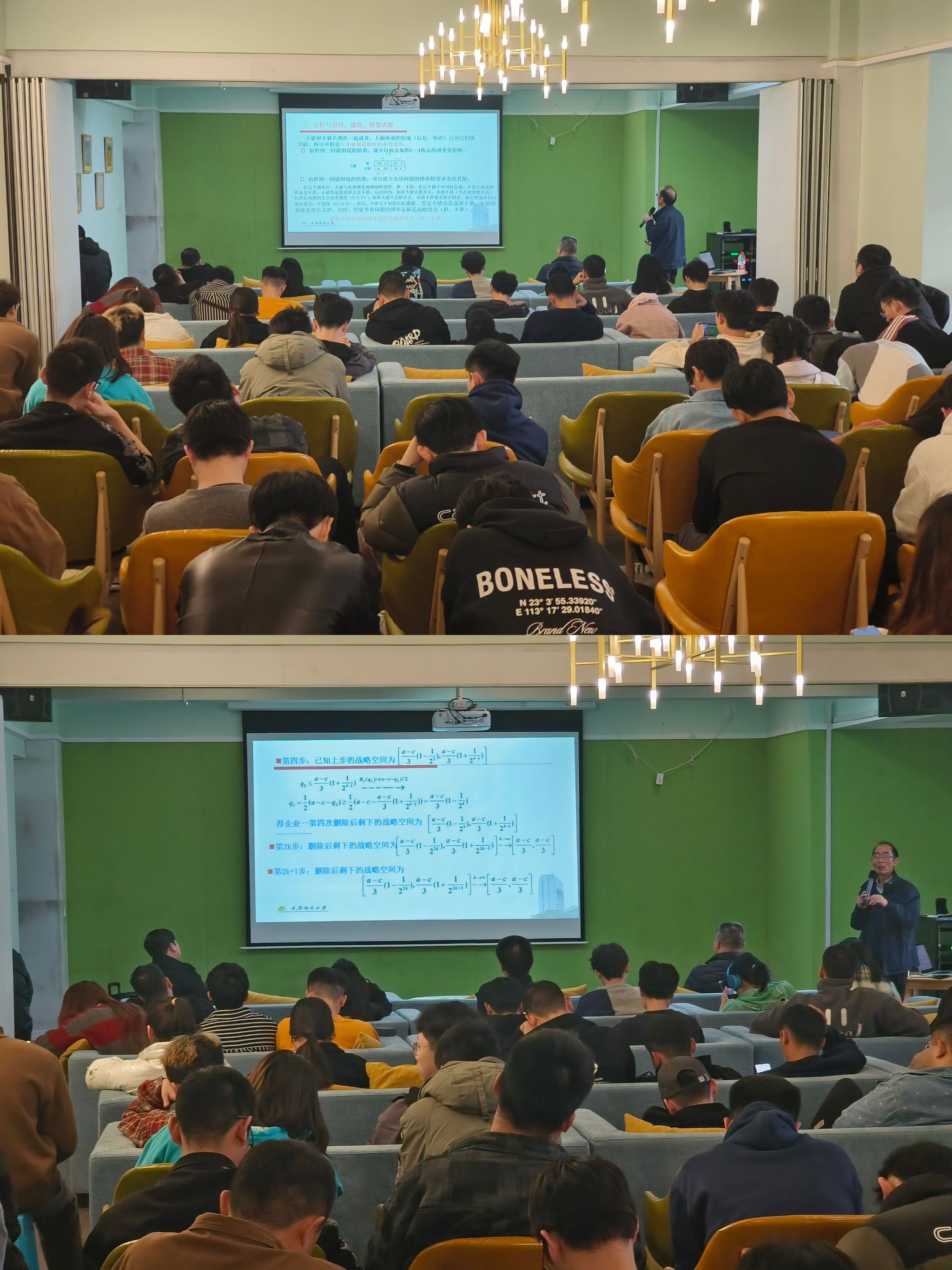 杨教授随后又向同学们阐述了博弈论的三个基本概念:收益矩阵、占优策略、纳什均衡。收益矩阵:一旦决策者从单人变成至少双人,决策就从一维的得失问题变成二维的利害关系问占优策略:如果你采取行动,我会占优势;你不采取行动,我也会占优势。纳什均衡:一种博弈的“稳定结果”,谁单方面改变策略,谁就会受损失。由简单的公式来推导出博弈论的概念。
