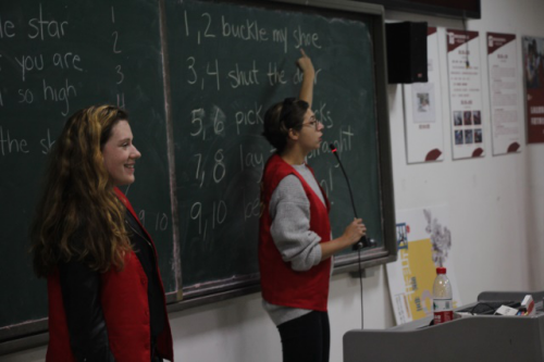 面对这个陌生又十分具有挑战的课堂,Rachel和Kelsey决定由她俩轮流一人一句来进行教授。首先,Kelsey从“twinkle”开始一个单词一个单词的教大家,孩子们一遍一遍的跟着读“twinkle”;Rachel则从“How”开始一个单词一个单词的教大家,孩子们又一遍一遍的跟着读“twinkle”......一个单词一个单词反反复复的练习,两位老师在交的过程中不但关注到每名小朋友都有参加还关注到每个小朋友的发音,确保听到所有小朋友的练习后才教下一个单词,对发音不准的她们还会反复再教几遍。随着一个单词一个单词的学习,慢慢的一个词、两个词、一个短句......小朋友们越来越熟悉,展示出来的领悟能力及对语言的敏感程度也大大超乎了外教的预期,一个小时左右的时间,小朋友门便学完了整首诗歌。两位外教鼓励小朋友们到讲台上展示自己的学习成果,小朋友不仅完整唱完了整首歌,大家的发音和舞台表现能力也得到了外教和志愿者们的一致认可。