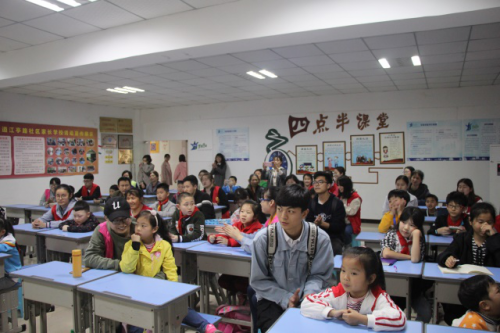外教Rachel首先在黑板上用英文写好了第一首诗——《小星星》。她用比较有限的中文夹杂着英文,开始了她今天的课程:“你好,How are you?我叫Rachel,我是老师。”她每讲完一句,都会停顿下来鼓励小朋友们跟着她一起说。“Kelsey and I are gonging to teach you ‘twinkle twinkle little star ’in English”当然为了使小朋友们能够理解外教所说的每一句话,志愿者们也积极转变身份变成了临时翻译,给在场的每一位小朋友们服好务。