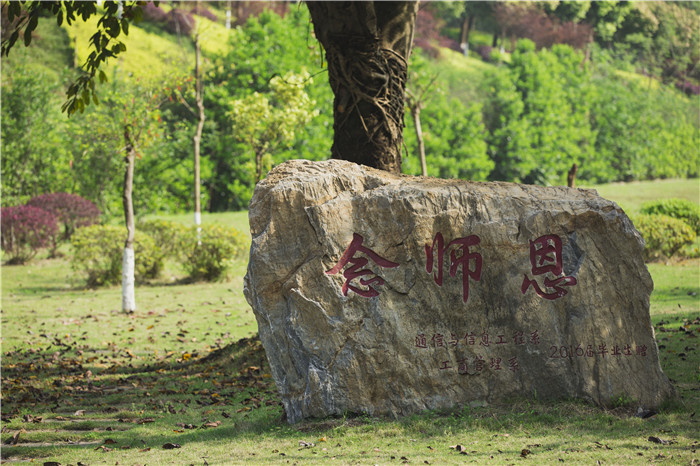 师恩难忘意深浓,桃李人间茂万丛。历苦耕耘勤育李,谆谆教诲记心中。矗立于园中的师恩石,在一片春意中最是惹眼,寓意着润物细无声的可贵。