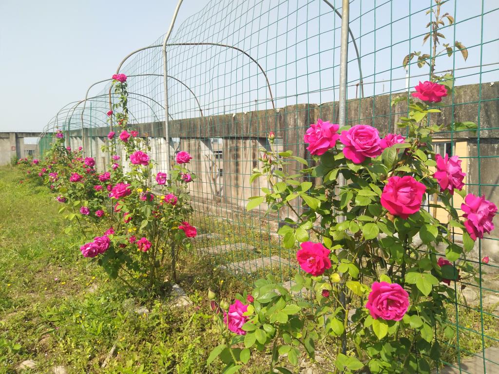 伴随着春日里的灿烂阳光,我们来到学校C区的花卉种植实践基地,一抹春日难得一见的校园美景藏匿在此,令人不禁拍手叫好!一丝香气悠悠地袭来,越来越浓,信步来到墙根下,只见耀眼的粉红色,攀墙而上,像媚娆的花帘,从墙头密密匝匝垂下,淡淡浅浅的盈眼粉红铺满了眼球,春风拂过,一簇簇拥挤的花儿仿佛在低吟,在浅唱。让我不禁想起“正月迎春花儿黄,二月春兰吐芬芳,三月桃花粉红装,四月蔷薇开满墙”。