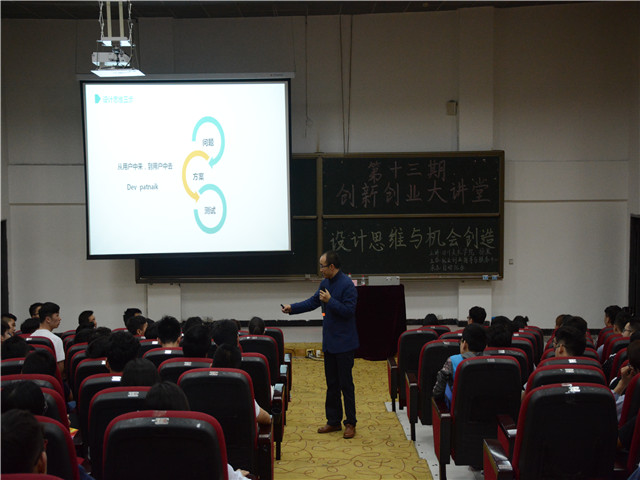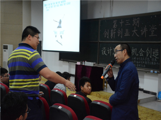 讲座伊始,杨寒老师随即抛出“什么是创业?”这一问题,得出“创业就是要创造属于自己的职业”这一观点。从设计思维方向,他提出艺体教育的重要性:现在大部分学子面临到的就业难的现状,很大程度上是教育方式的问题。学校的教育要实现多方位化,科学教育和人文教育也是未来生活中不可或缺的一部分。这一结合也充分体现了我校的三位一体教育模式的实践性和重要性。