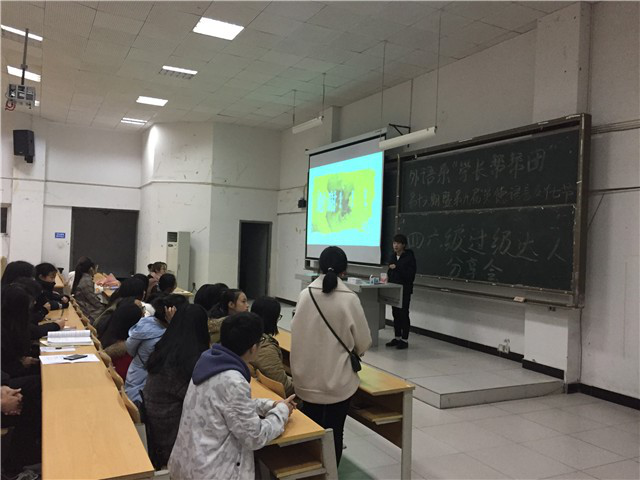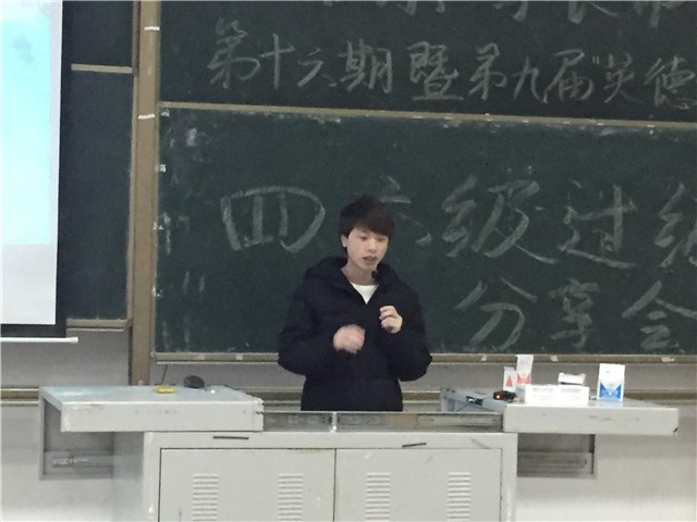 2017年12月14日,第九届“英德语言文化节”之英语四、六级达人分享会在3102教室举行,由大三学长黄军来分享关于过英语四、六级的经验干货。