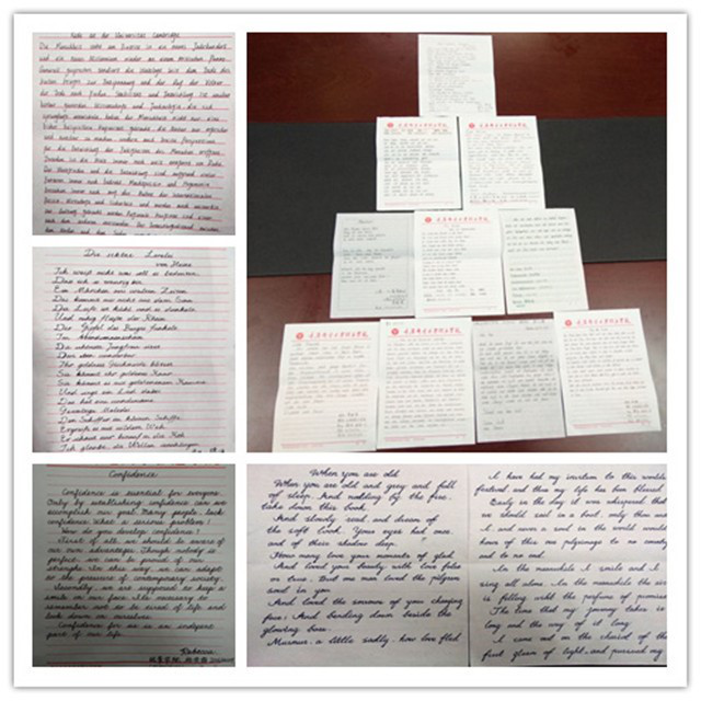 英语组吴孟祎的作品得到老师们一致认可获得英语组书法大赛的一等奖。参赛选手朱文文以优美的连体获得此次英德文书法大赛德语组的一等奖。