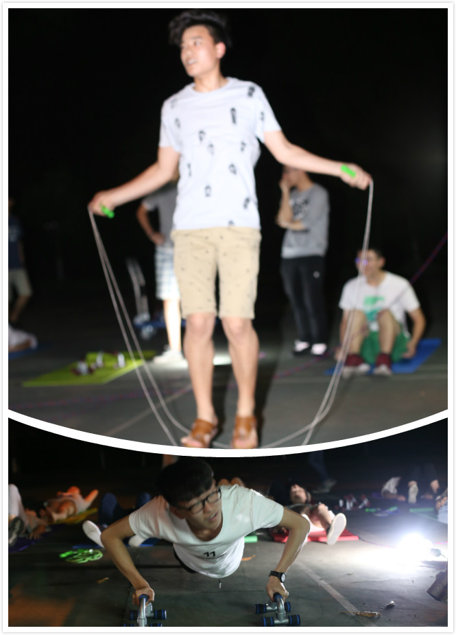 分好组的4队人,以Keep运动课程相结合的形式,开始了集体挑战项目,因为是第一次集体运动,大家设定了大约30分钟的集体项目PK,包括跳绳、俯卧撑、下蹲等各项运动。小伙伴的脸上开始渐渐地有汗珠露了出来,有的还有点坚持不住,开始在一旁歇息,似乎已经很久没有这样运动。