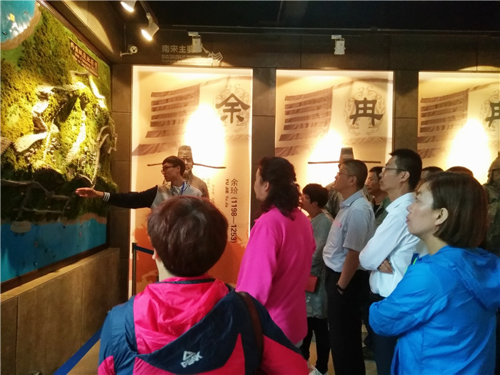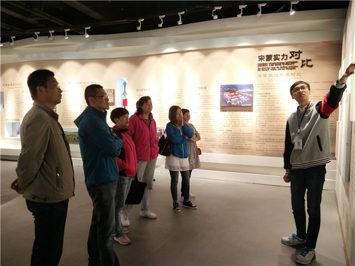 在二楼的展厅中,他们对合川文化非常感兴趣。一些人在认真聆听着讲解员沈一鸣对于钓鱼城之战的讲解;亦有一些人低头仔细阅读多媒体中关于合川风景、美食和历史人文的介绍。在讲到公元1243年,钓鱼城36年抗战正式拉开序幕的时候,合川区文史委员会的老师按捺不住内心的激动,充当起了临时讲解员,为在场的各位详细讲解了宋蒙金鼎立背景下的大小战役。