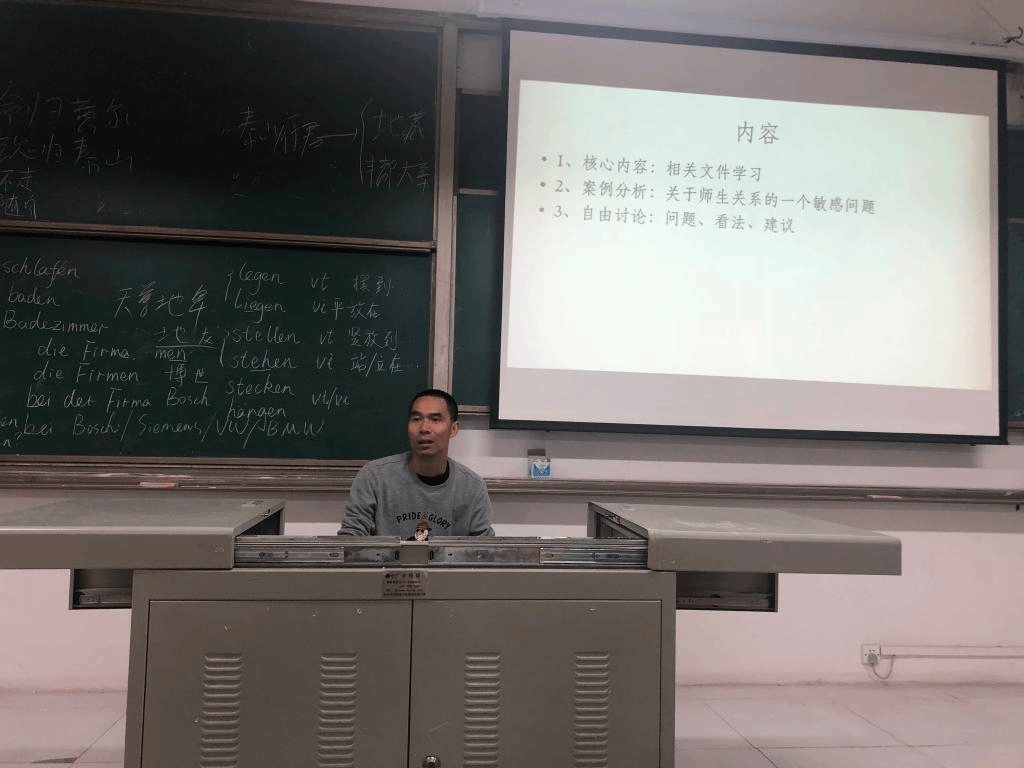 任德利老师还在本次学习中提醒老师们应严格要求自己,自觉遵守学校的规章制度和有关规定,洁身自好严厉杜绝师生恋。并以我国两对著名校园师生恋和相关案例,认为美国高校禁止师生恋的根本原因在于老师和学生之间权力的不平等。“双方同意”的两性关系在权力不平等的人之间是很难存在的,因此禁止师生恋的本质是防止权力被滥用。