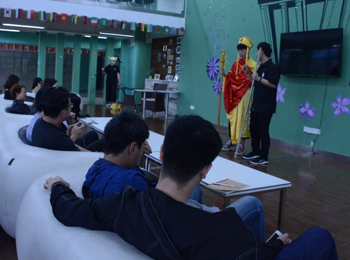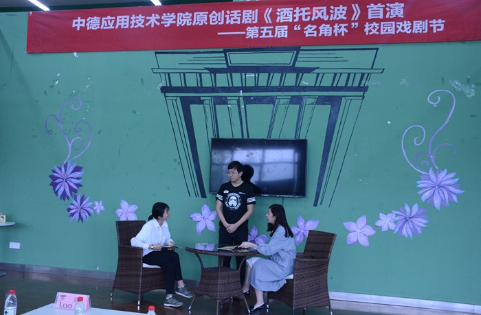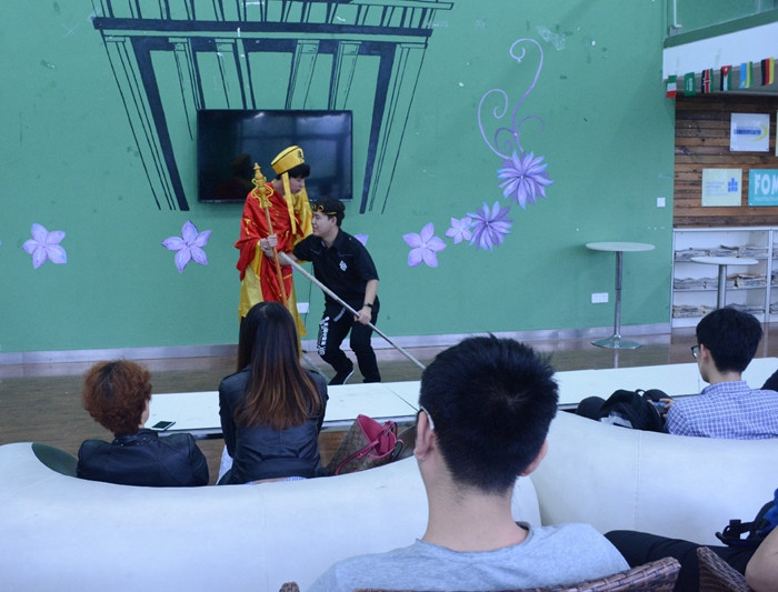 2018年4月24日中午13:00整,第五届“名角杯”戏剧节之中德应用技术学院原创话剧——《西游记之巡查记》在中德书屋准时拉开序幕,除了早早就来到现场焦灼等待的同学们,这次戏剧节还特别邀请了艺术教育中心指导老师陈虹青、学工办主任武强义及全体辅导员老师们莅临观看。虽然外面飘着雨,但书屋里却洋溢着浓郁的艺术气息。