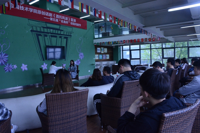 延续着原创话剧首演的高潮,次日,原创话剧《酒托风波》于12:30准时在中德书屋上演,这次邀请到的是艺术教育中心的罗波老师作为评委,“酒托”这看似及其普通的两个字,将在这里如何诠释?伴随着热烈的气氛,表演准时开场。故事的开始女主打着电话缓缓走进咖啡厅,找到空位后并没有着急坐下,随后便焦灼地着等待男主的到来。看到男主后高举右手示意,站了起来和男主介绍自己。此时的两人交谈甚欢,在简单的交谈后,服务员很有眼力的上前。推杯换盏间,激烈碰撞的不止是酒杯,还有的是预谋和手段,剩斗士、直女癌......小小一间咖啡厅,尽显人生百态,一场看似普通的相亲会,却折射出人生百态。演员们的表演赢得了在座同学们的阵阵掌声。