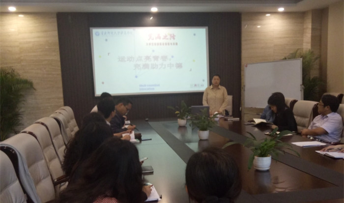 会议开始,莫老师大致介绍了学院完满教育四大板块的概况以及四位指导老师的分工情况,继而通过一段2018年校园啦啦操大赛中德学院参赛视频引入本次介绍。首先,莫老师就竞技体育可以对当下的大学生带来哪些好处展开了介绍,她讲道,竞技体育带的来的功效是持久的,除了身体的锻炼外,精神的培育与引领更明显,可以为当下大学生带来健康的体魄、健康的心态以及健康的气质。继而就大学生活与竞技体育之间有着各种微妙的联系展开了介绍,学生通过竞技体育除了可以锻炼体魄,拥有阳光的心态以及提升意志力与毅力外,更可以锻炼竞争求胜、团队合作精神,具备领袖气质等诸多好处。学校为培养学生竞技体育精神,从平台资源、教师资源、场地资源等多方面进行了资源整合,斥巨资打造各类学生运动场地,聘请了国家队等退役运动员,举办阳光杯各类竞技体育赛事。