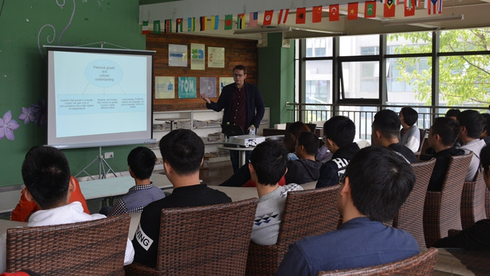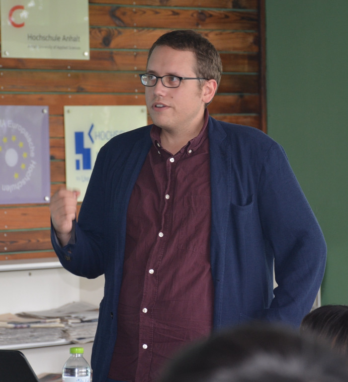 2018年4月26日星期四中午12:30我们在中德书屋开展了 “相约德国”主题交流活动。本次活动我们有幸邀请到了德国外教Julian, Julian Goßmann, 2015年7月毕业于维尔兹堡大学。维尔兹堡大学是德国最古老的大学之一,已经有600多年历史,诞生过14位诺贝尔奖得主,在世界上享有盛名。Julian大学期间主修文理高中师范专业,掌握了深厚的拉丁语知识,他还精通欧洲和世界历史,熟悉宗教学和神学,对各国文化和历史都略知一二。
