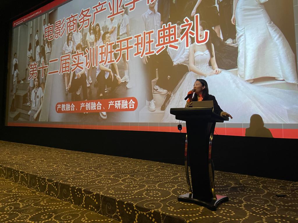主持人电影商务产业学院张云潇老师宣布第十二期电影商务产业学院实训班正式启动,并介绍了往届实训班的实习成果及本届实训班的培养目标。送上了由万画影城为实训班同学们准备的精美伴手礼——电影《人生大事》周边发箍,同学们立刻戴在了头上,感受到了满满的归属感。