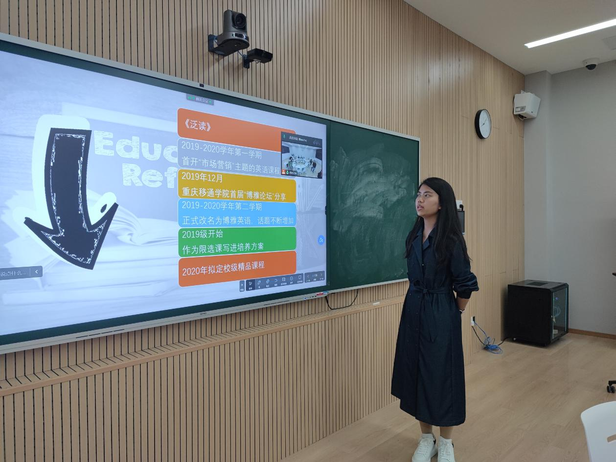 随后,唐智盟老师结合《博雅英语》课程过程性考核改革实践经验进行分享,该门课程自2019年开课到2020年拟定为校级精品课程,课程团队坚持不断创新课程考核方案,改变了相对固化的试题形式,克服了考核内容片面化、考核形式单一化、成绩评定简单化等问题,创新融合“英语文化+商科教育”,创设情景教学,开展互动课堂,构建了多元化、全方位的评价模式,不仅调动了学生学习的主动性和积极性,还培养了学生批判性思维、跨学科素养和综合表达能力。