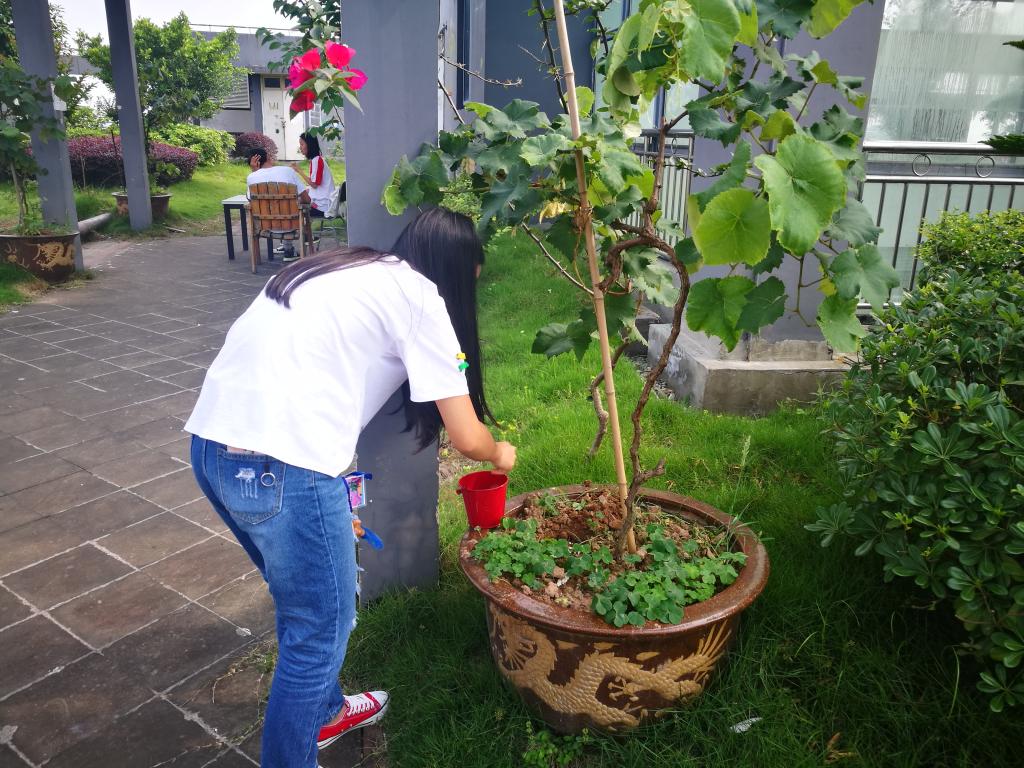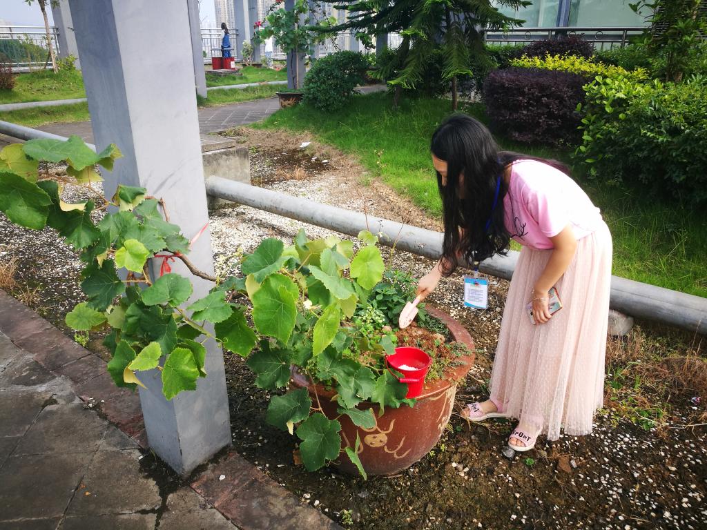 接着,社员们就进行浇水与施肥工作,施肥看似简单实则不然。施肥需要很严格的控制施肥的量否则很容易出现烧苗的现象。社长亲自示范后,社员们就开始自己动手了。他们首先在土壤中使用挖掘工具挖个小坑,其次,他们在特定的勺子中装上四分之一的肥料,然后轻轻地倒入坑内掩埋,最后对植物进行浇水。浇水也有研究,要把植物浇透,直到盆下滴水才有效果。最后,社员们又对五教楼顶、月牙湾种植基地进行了植物的维护。