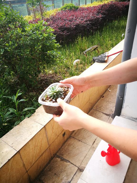 花卉协会的同学依次到行政楼各楼层帮助查看花卉的各项问题,然后就把植物拿出门外进行现场教学。这株植物的生长状态相对比较好,但是土壤板结成块,不仅影响植物营养的吸收,还有可能造成植物根系的死亡。对于这个问题社长拿出来早已准备好的土壤改良剂,在花盆内撒上了药物与水,相信不久植物就可以恢复正常。