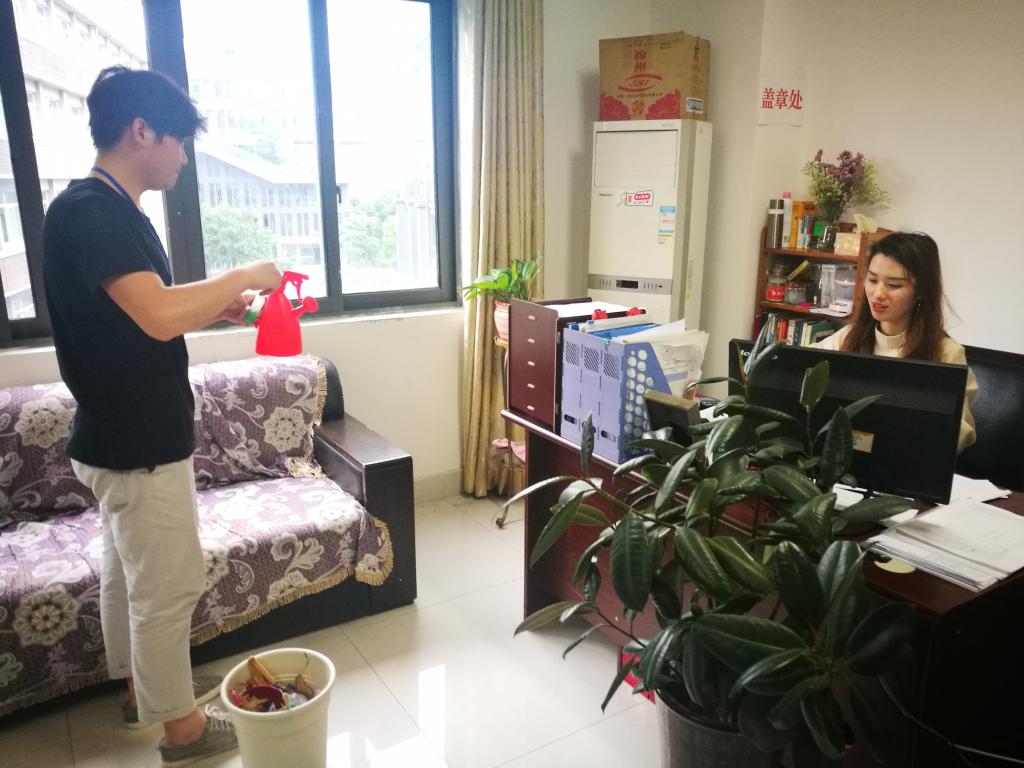 绿植在我们的生活中扮演着中重要的角色,美化校园环境的同时,也可以为大家减少工作的疲劳。夏日持续的高温宣示着它那火一般的热情,炽热的目光望向大地的时候,也使很多老师和同学的绿色植物出现种种问题。为了解决大家养护花卉的困惑,针对性的治疗植物生长的问题,花卉协会一行人于5月4日青年节来到行政楼进行植物维护。