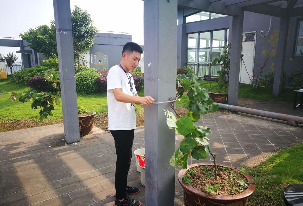 之后社长带领社员们来到了图书馆顶楼的花卉基地———天街花园。这里种植了很多葡萄。因为受前几日多雨天气的影响,植物生长的很茂盛,很多枝条已经无法承受重量,有倾倒的迹象,所以社员们就使用绳子对葡萄藤加以固定。