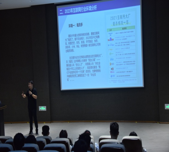 结合学院学子专业和办学特色,闫会峰院长接着又对2023届互联网行业环境作出分析。互联网行业发展迅猛,但也面临着载员多、竞争大、岗位少等问题。针对这些问题,闫院长提出互联网其实不是一个行业,而是所有的互联网+金融、医疗等。闫院长鼓励学院学子不仅要搞好专业技术,还应该开阔眼界,善于拓展,真正做到成为社会连接的基础模块。