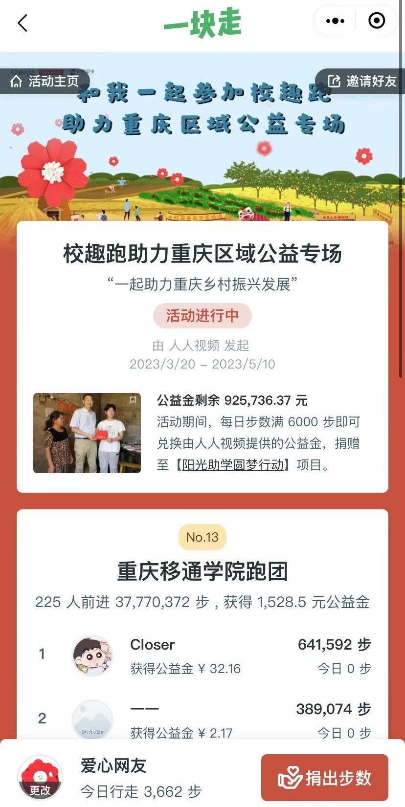 本次“校趣跑-徒步计划”或许有终点但腾讯公益×校趣跑还未结束;社会公益活动还在进行。所以,请不要停止不要犹豫,让我们立即行动起来。加入到“校趣跑”活动中来,为那些需要帮助的人献出你的一份爱。