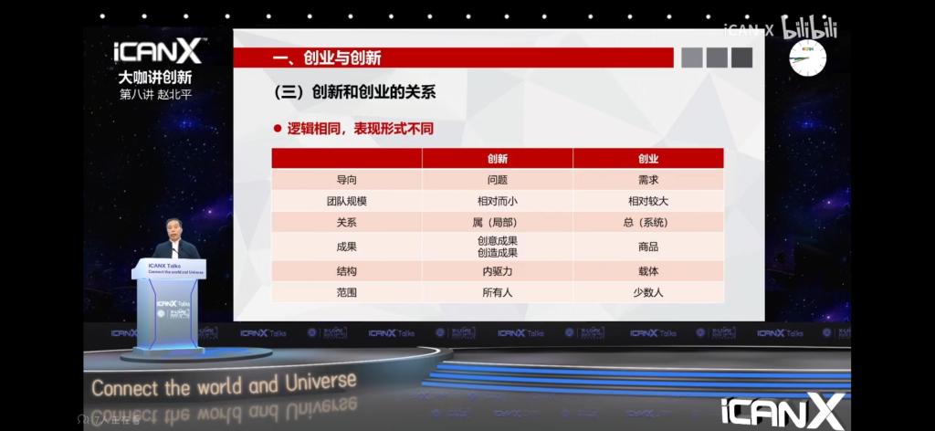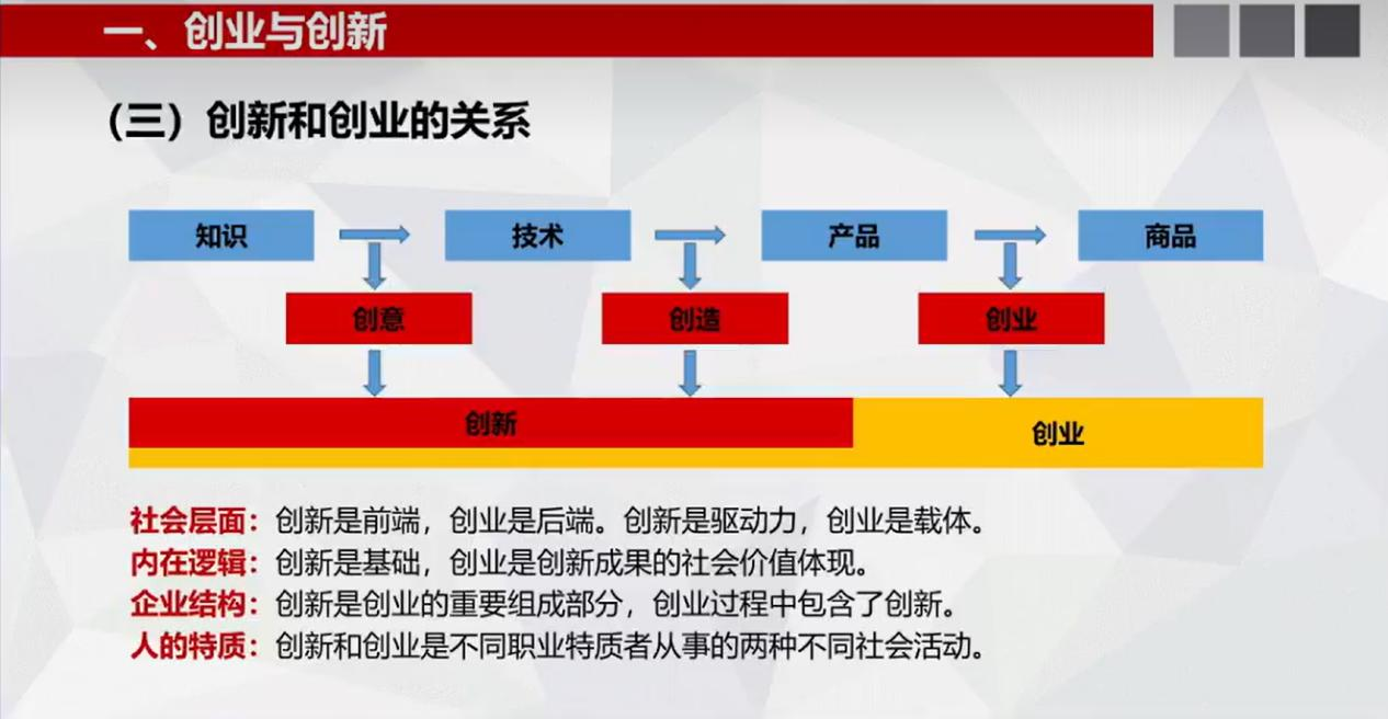 创业是追求事业成功的过程,在这个过程中创新是必不可少的,赵教授指出“创新”在“十四五”规划中有着重要地位,习总书记也多次提及“创新”这一关键词,可见创新对于一个国家和一个民族发展的重要性。那么创新和创业究竟有何关系?赵教授指出,我们整个社会是一个创新创业链条,如何将所学知识通过创意实践变为技术,然后用技术创造出产品,又将产品通过创业变为商品,这就是一条完整的链条。前两部分属于创新,由此可见,创新是创业的基础和重要组成部分,是两种不同的社会活动。总的来说:创新与创业的逻辑相同,都是发现问题、分析问题、解决问题、总结问题,但二者表现形式不一样,在最后成果、结构、范围方面二者存在着本质区别。