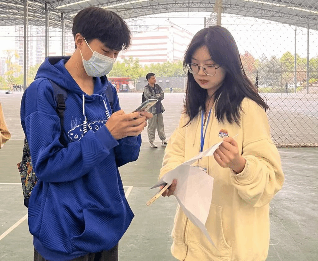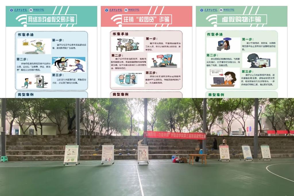 比赛过程中,场上选手旗鼓相当,场下成员也没闲着,她们拿出手机扫描工作人员的问卷调查二维码,积极参与问卷调查,认真回答着问题;赛场外圈摆放着反诈宣传板,大家在空闲之余进行着浏览,仔细阅读将反诈知识铭记于心。每一件事她们都秉持着认真的态度,认真的对待这一切,这就是外国语学院学子!
