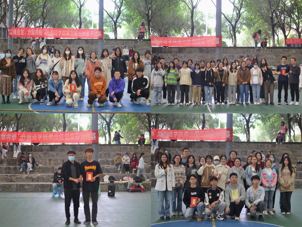 本周四,决赛伴随着期待终于来啦!经过同学们一次又一次角逐当中决出了本场比赛的最终名次。22级英语8班斩获冠军,21级英语3班第二名,21级德语2班第三名,22级英语2班第四名。邀请了外国语学院副院长祝玮老师、阳果老师、杨茂林老师、于彩仙老师依次为他们颁发获奖证书!此次拔河不仅仅是一次力量的较量,更是一次班级凝聚力的体现,展现我院各班拼搏进取、青春上扬的风采。