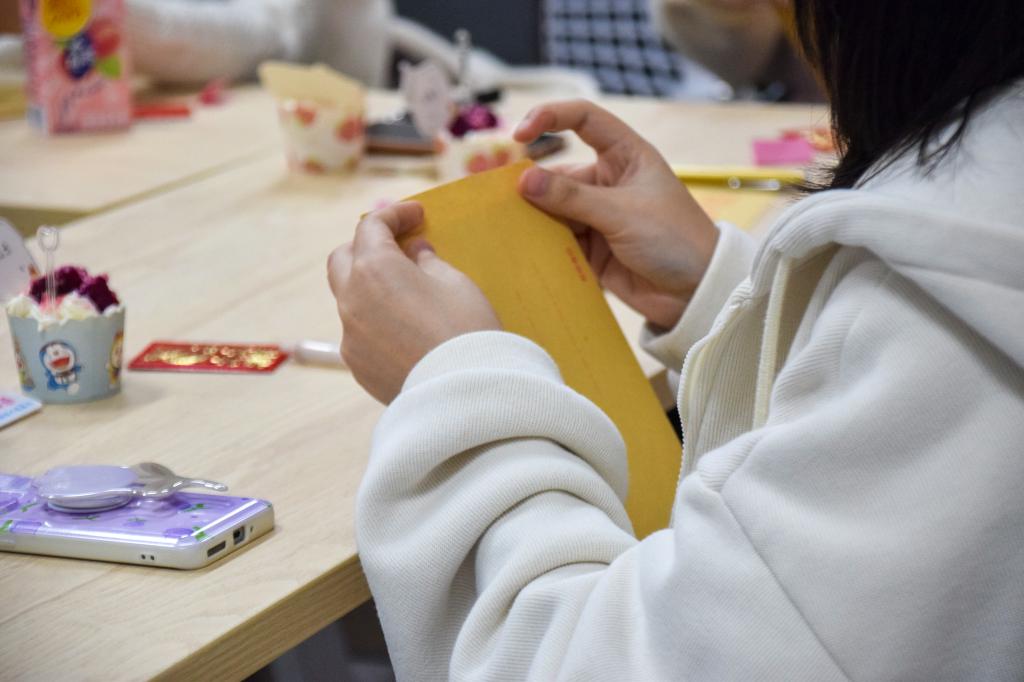 为了让所有同学对异科导师团队有家的归属和温暖,汪小丁老师精心设计,准备了专属名牌和蛋糕。活动中还设计了“给未来的自己一封信”环节,让每位成员给四年后的自己写一封信,引导大家坚定自己的理想信念,成为更优秀的自己!惊喜红包的派发,更是让每一位成员都惊喜满满:“共进午餐券、温暖奶茶券、小丁姐陪伴券……”一张张奖券都让同学们感受到了汪小丁老师的重视,也让这个新生团队的凝聚力更强。