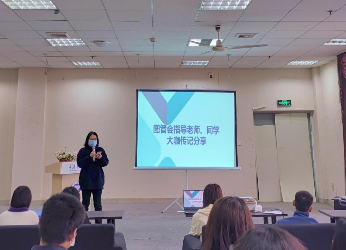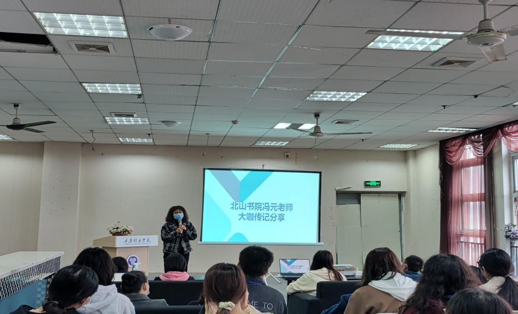 大咖阅读悦见未来,图书馆特邀嘉宾北山书院冯元老师进行大咖传记分享。冯老师为大家分享了“大咖阅读”是如何一步步走到现在,每一本书都是学校优中选优,精挑细选,能够有效帮助、引导学生在阅读中学习,在阅读中成长。为了让同学们更好的理解学校的“四位一体双院制”特色人才培养体系,为以后的人生做好规划,开设“大咖书籍阅读计划”是十分有必要的。生活中的每个选择都可能改变你的人生轨迹,而阅读别人的人生,尤其是这些大咖们的人生,可以让你开阔视野,帮助你做出更好的选择,抓住机遇。在冯元老师分享结束后,图书馆余届娟老师以及图管会曹剑等同学进行大咖传记分享,交流自己的阅读体会。