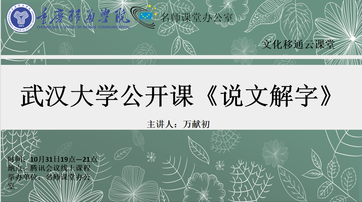 “上古结绳而治,后世圣人易之以书契,百官以治,万民以察。”汉字是中国传承至今最宝贵的文化,是国家一统存在于世的象征,是中华文化传承五千年来的“根源地”,汉字的出现真正带动了人类在时光历程中传承文化的脚步。10月31日晚7点,“文化移通云课堂”播放了武汉大学万献初教授的《说文解字》,带领同学们走进汉字的起源和发展历程。