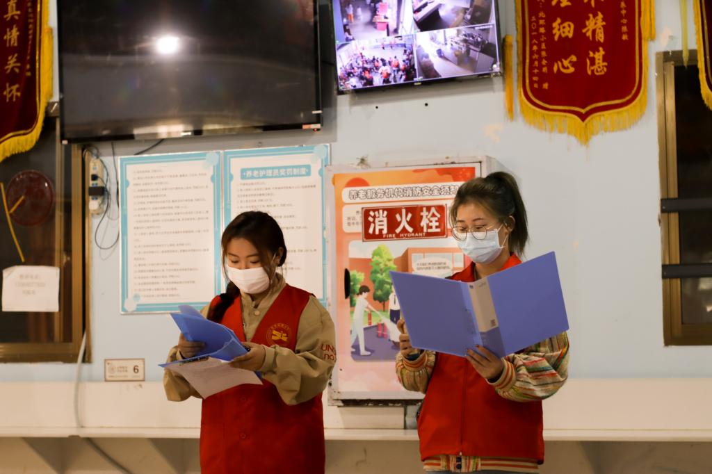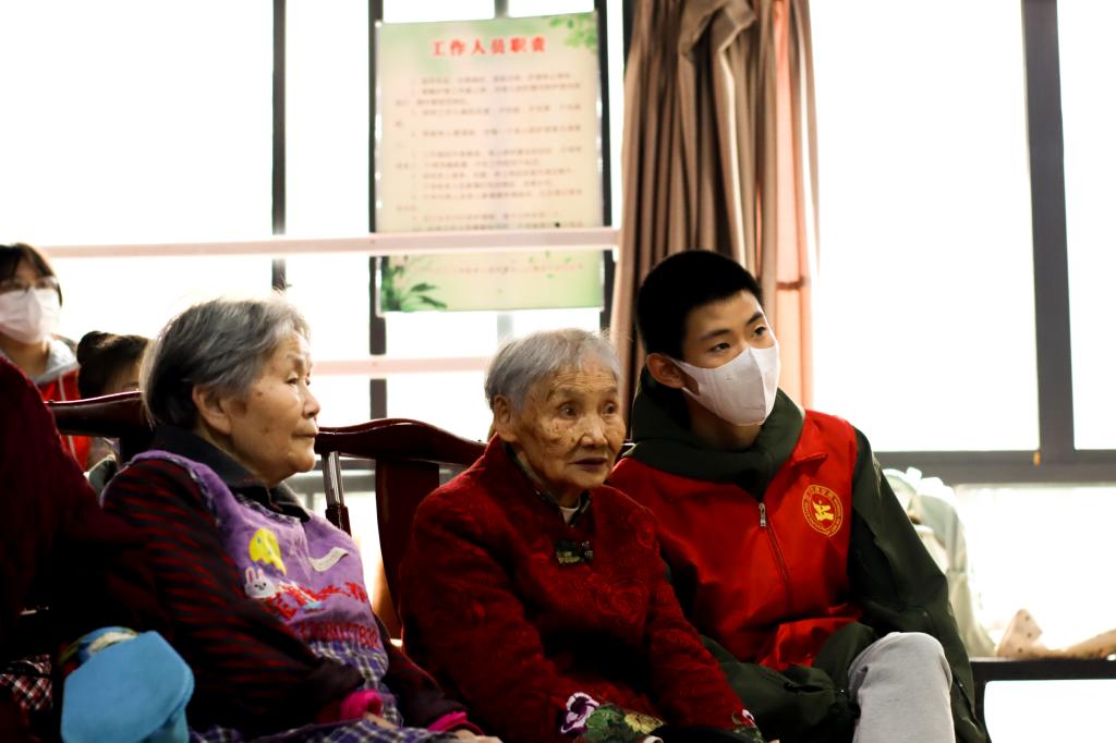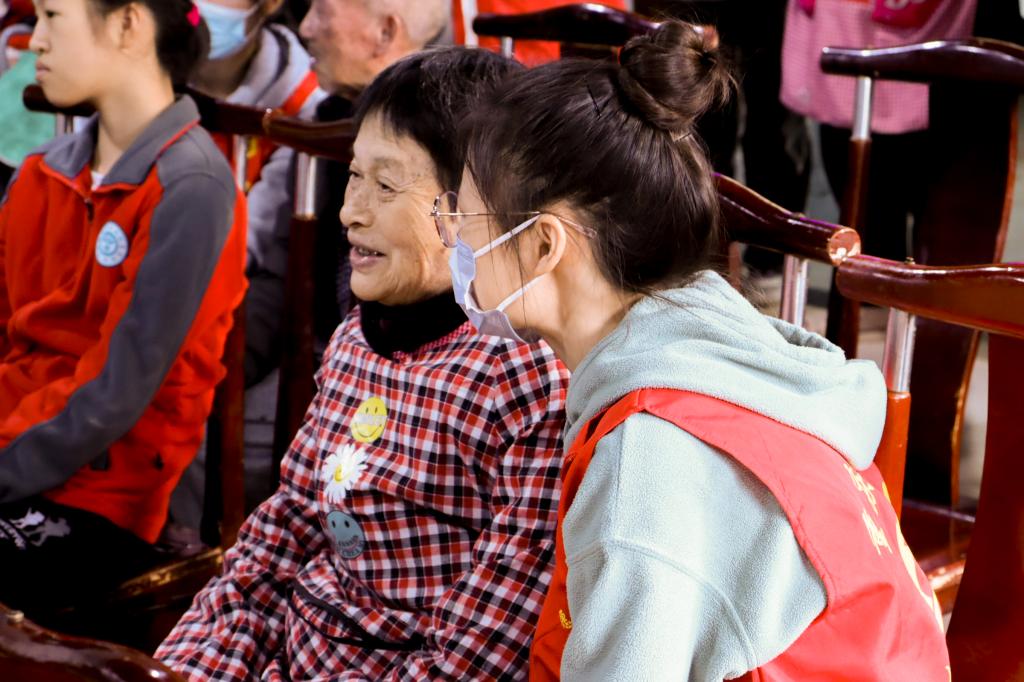 到达目的地后,志愿者们陪伴在老人身边,嘘寒问暖,了解他们的日常生活,排解老人们内心的孤独。在整理好表演区域后,志愿者有序将老人们搀扶于观看区坐好,和老人谈天说地,唠家常,房间里的氛围马上活跃了起来。