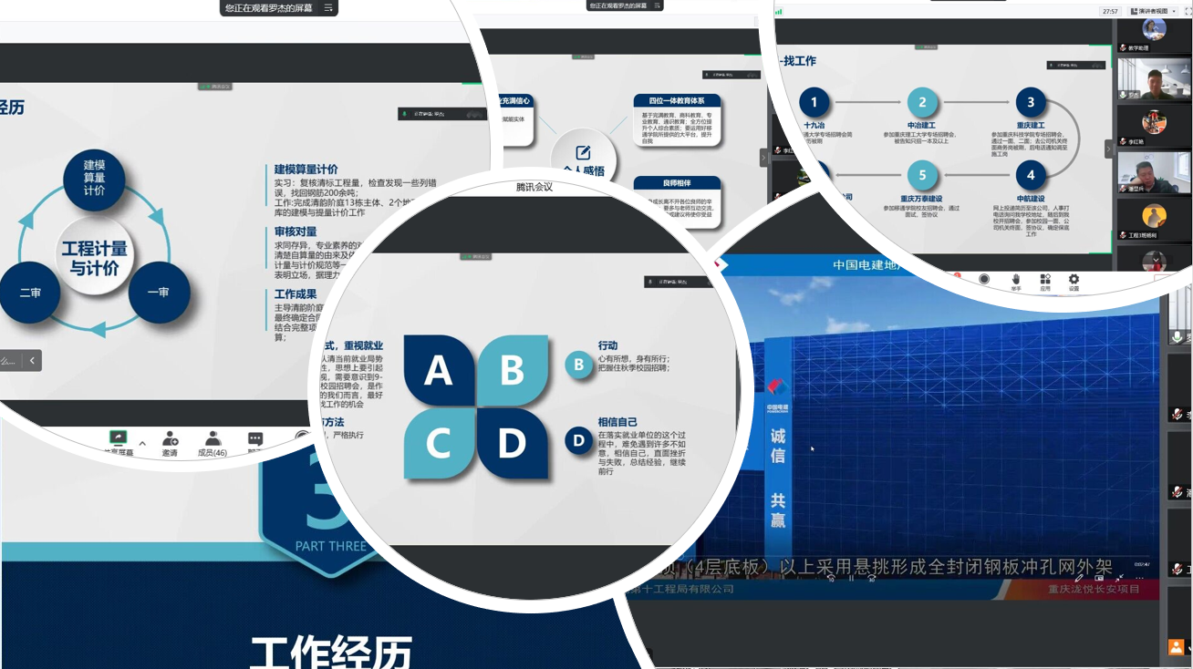 谈到工作,罗杰同学从校内实习开始,详细地分享了自己的求职过程和工作经历,从广联达公司组织的学科竞赛答疑专家开始,到十九冶、中冶建工、重庆建工等,到最后通过中电建建筑集团有限公司面试并落户北京,层层递进,逐步向前,用自己的亲身经历向学弟学妹们展现了一部激烈而真实的求职历程,也为学弟学妹这些职场小白带来了宝贵的实践经验和人生感悟。引发学弟学妹们纷纷提问:我们出来能找哪些工作?现在建筑行业怎么样?……面对学弟学妹们提出的问题,罗杰同学一一耐心解答,从当前社会就业形势,结合社会、生活、工作、家庭等各方面进行深入分析,为同学们带来了生动有趣又收获满满的一段美好时光。
