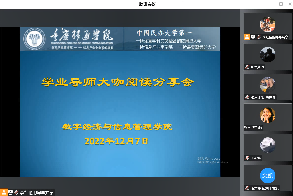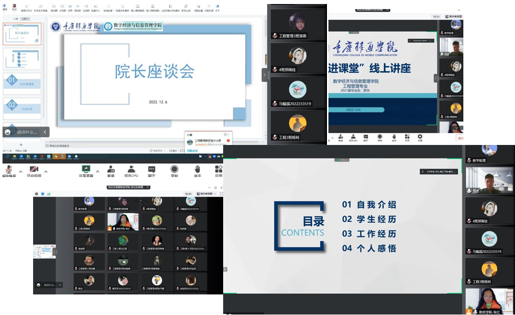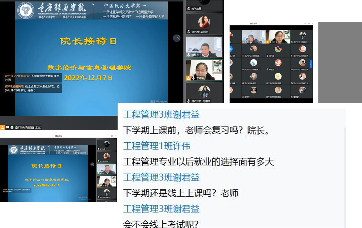 为加强学院与学生的交流,了解学生的实际困难和学习生活状况,12月7日下午,数字经济与信息管理学院在云端召开了“以彼之所愿,携手同行”为主题的院长接待日、优秀学长讲专业以及学业导师引领大咖阅读的融合性座谈会,在线与学生互动交流、答疑解惑、反馈需求。参加本次活动的有数字经济与信息管理学院院长潘显兵、副院长刘贵容、教研室主任周梦娇以及张红、李红艳等老师,还有优秀毕业学长——2021届工程管理专业毕业生罗杰同学、2022级工程管理1-4班学生代表和2022级资产评估专升本1-2班学生代表。