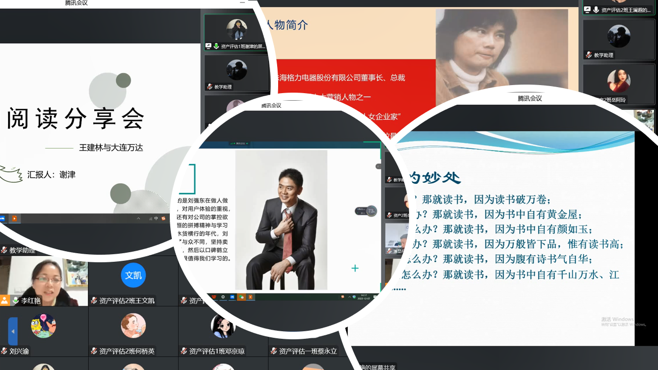 正所谓“腹有诗书气自华”、“最是书香能久远”,学业导师李红艳老师以北宋诗人苏轼的一句名言入题,娓娓道来读书的妙处,与同学们一同领悟书香之美。随后由2022级资产评估专业的谢津、高敏和王澜暇三位同学从不同角度为大家分享了大咖经典阅读的深刻感悟。从万达总裁王健林到京东CEO刘强东,再到格力的女中英豪董明珠女士,展现的不仅是一部部商业传奇,还读出了耀眼的光环背后的辛劳、汗水和坚毅,让我们了解大咖人物的传奇人生的同时也体味出浓厚的人文情怀。