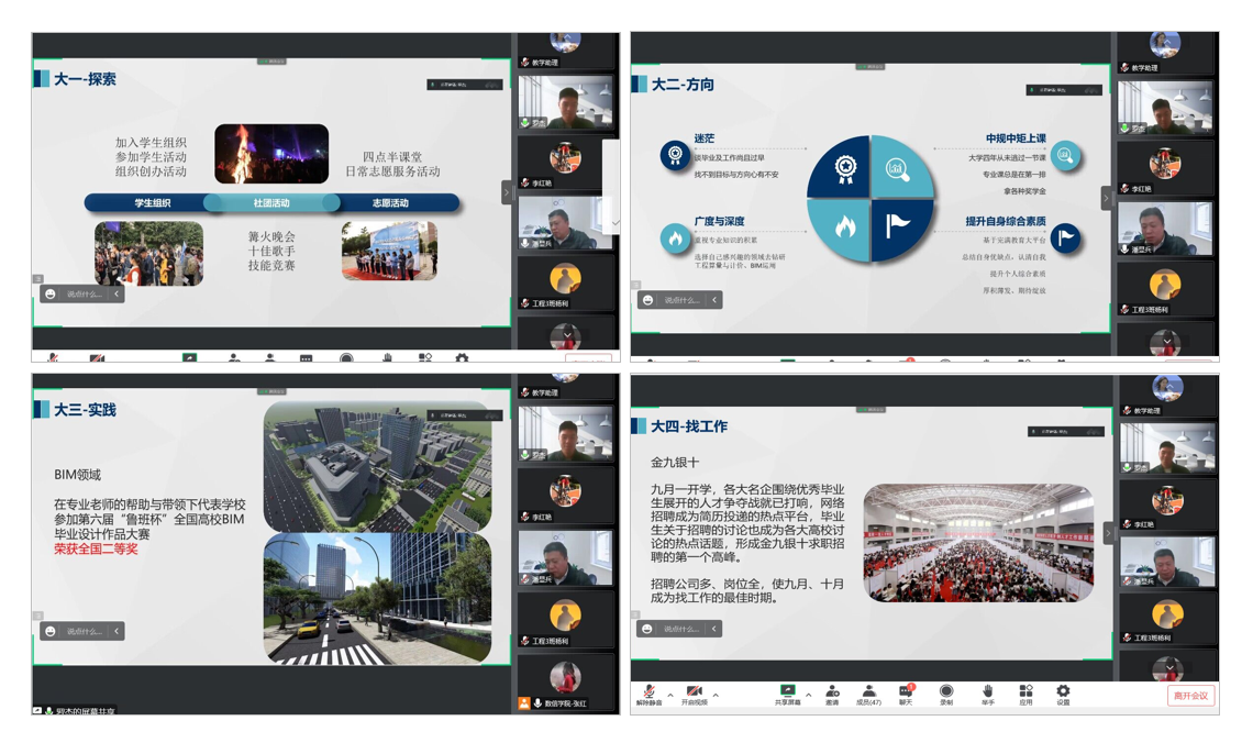 座谈会伊始,罗杰学长从不同方面分享了自己的学业成长、工作经历以及个人的收获感悟。在分享学生经历中,从大一探索到大二树立方向,从大三的实习实践到大四找工作,罗杰学长始终积极加入多个学生组织、参加各项技能竞赛以及志愿服务活动,在迷茫中摸索,在摸索中实践,在实践中求成,在校期间获得第六届“鲁班杯”全国高校BIM毕业设计作品大赛全国二等奖等多项荣誉。