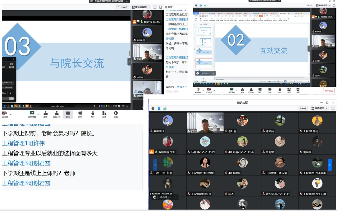 “请问天气太冷,可以在阳台安装热水吗?”“请问我们下学期多久开学?”“请问活动很多,我们都要修学分吗?”……面对同学们的种种疑惑,两位院长本着“一切为学生,为了学生的一切”的理念出发,关注同学们的情绪和迷茫,并满怀热情地引导同学们:能解决的问题学校会努力解决,同时鼓励同学们要在现有条件下克服困难,一切以学校通知为准,平时的学习和活动要与自己的兴趣爱好相结合,同时在疫情特殊时期保护好身体,量力而行。学院老师、领导也都会陪着同学们一同面对一切困难,为同学们创造安定的学生、生活环境保驾护航。