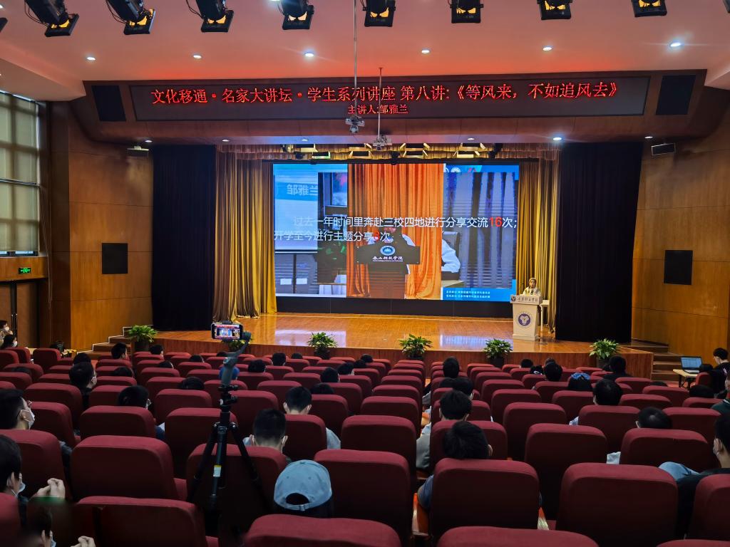 等风来,不如追风去,追逐的过程就是享受人生的意义,但如何去肆意追逐梦想?又如何轻松持续地做到持续追逐?11月3日下午16:00,在下里巴人剧场,2019级艺术传媒学院广播电视编导专业学生邹雅兰作为“我是名师”第八讲分享人与大家分享追逐梦想的挫折与成功。分享开始,邹雅兰同学就向所有人抛出一个有趣的问题:《甄嬛传》这部脍炙人口的电视剧,在剧中主角甄嬛的身上是怎样体现出“等风来不如追风去”这句话含义呢?