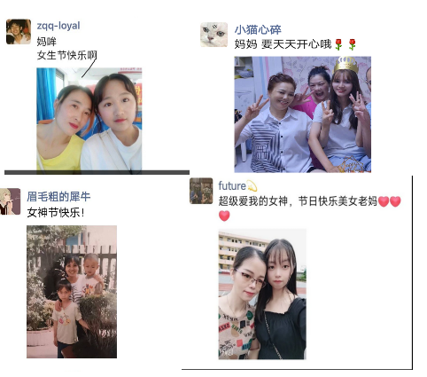 本次“三月伊人节。爱在记忆中”妇女节线上活动圆满完成,在此次活动中,同学们积极参与活动,同妇女们共庆这个特别的节日。通过写感谢话语,发布合照这样有趣深刻的方式,借此表达对各位长辈的爱意,敬意,更让同学们深刻的明白妇女节的意义。