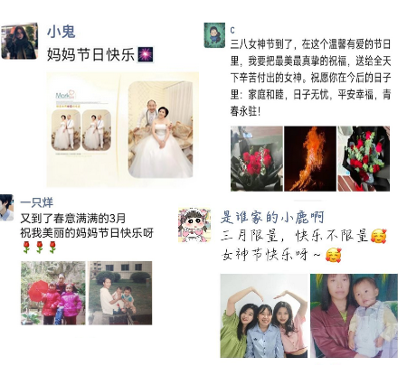 大数据与软件学院青年志愿者们借助三八妇女节为同学们搭建了一个述说“爱”的平台。本次活动采取与母亲或女性长辈的温馨合照或感谢话语发布于QQ空间/微信朋友圈的形式进行,这样的活动形式不仅让参与者回忆往昔,更让同学们重温与母亲、长辈以及女性朋友的难忘故事,让优秀的妇女节文化得到更好地传播。