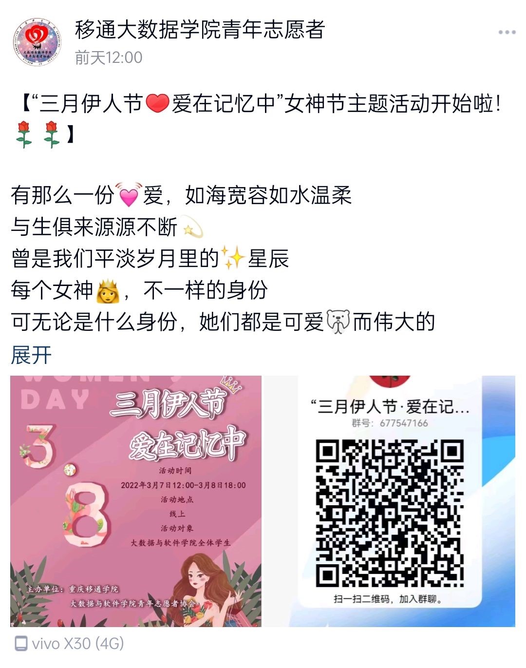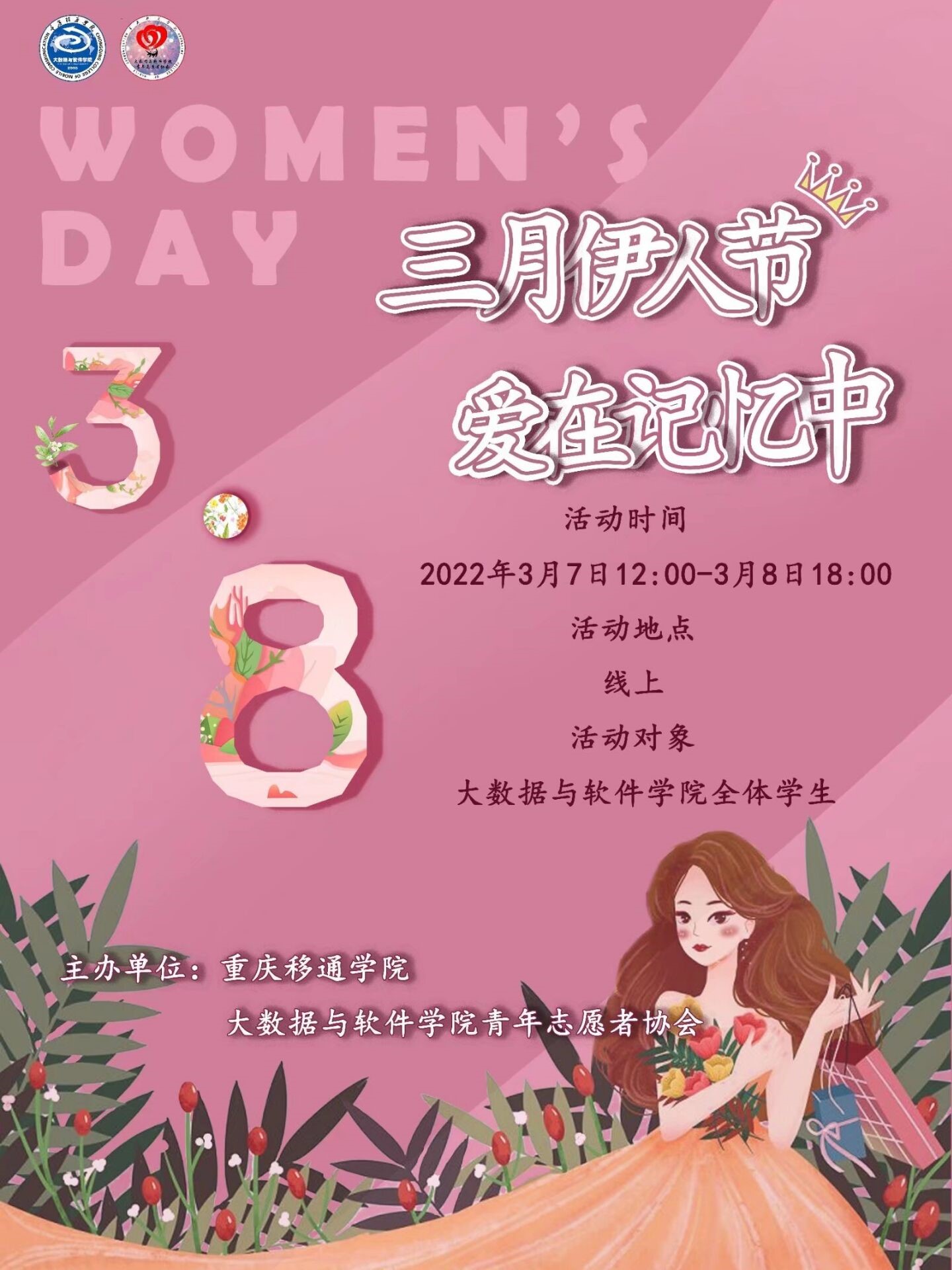 为表达对母亲的爱意、对老师的尊敬,让同学们学会感恩,尊重长辈,大数据与软件学院青年志愿者协会于3月7日-3月8日开展以“三月伊人节·爱在记忆中”为主题的线上活动。