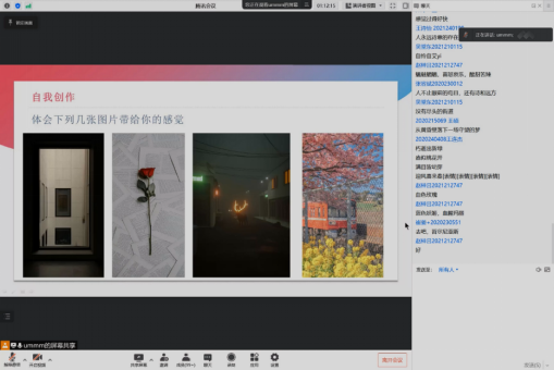 在同学们对诗歌的创作有一定的了解之后,主讲人再次展示出四张风格不一的图片,鼓励同学们根据图片的内容进行创作诗歌。同学们积极参与并分享自己即兴创作的诗篇,“穿过窗户的尽头,是一朵即将凋零的玫瑰。它在祈祷,九天之上的麋鹿带着自己,去追寻即将驶去的她。”又或是“岁月在他脸上刻下一道道沟壑,原来他也曾想有一个完整的梦,你以为他的自由是完美的,无二无女,你以为他不想被牵挂吗,不过是在春天里,寻一味最淡的余温”。
