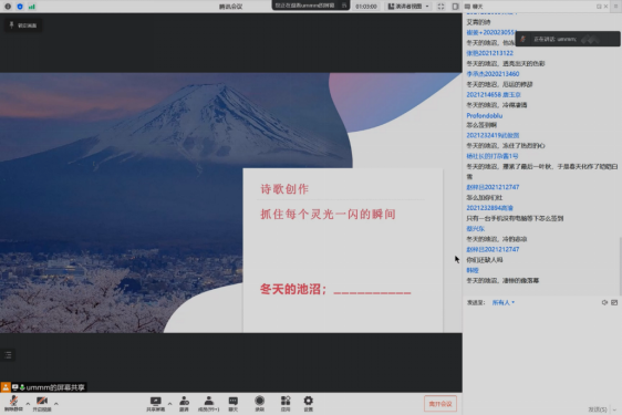 经过一个半小时的线上分享与讨论中,主讲人杨云翔深入赏析许多名家诗篇,向同学们讲解诗歌创作的要求与思路,并分享出自己的诗歌创作经验,鼓励同学们大胆用诗歌去表达自己的所见所闻所学所想。杨云翔社长与同学们的积极互动,在细致解答同学们疑问的同时,也在交流和沟通中使同学们越发了解现代诗,贴近现代诗,走近现代诗创作。三江文学社为同学们提供一个分享和交流诗歌的平台,也希望同学们能够在这个浮躁不安的时代里,能在诗歌中沉浸下来,找到属于自己内心的那份坚守。在感受校园诗歌文化的同时也能弘扬传统诗歌文化。