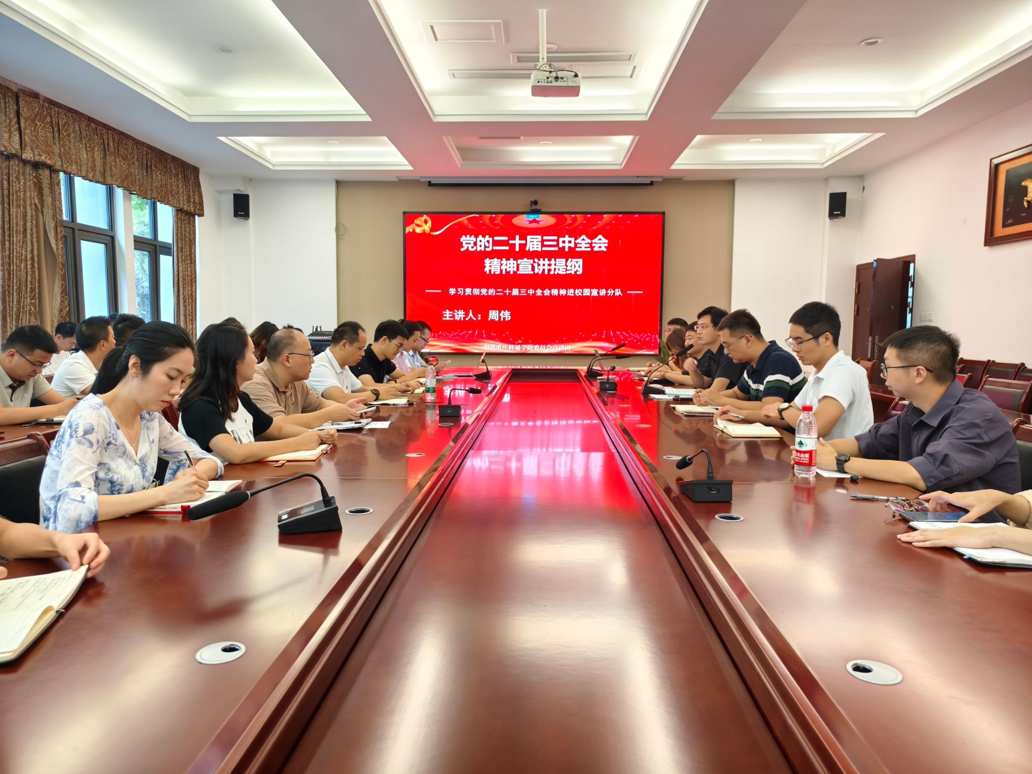 会上,周书记结合党中央部署和市委、教育部工作要求,从把握全会重大意义;深入学习领会习近平总书记在党的二十届三中全会上的重要讲话精神;全面准确理解《决定》提出的进一步全面深化改革的重大举措;贯通学习习近平总书记对重庆改革工作的系列重要指示要求,加快打造全面深化改革先行区;全力以赴抓好全会精神贯彻落实等5个方面,对全会精神作了全面宣讲和深入阐释。