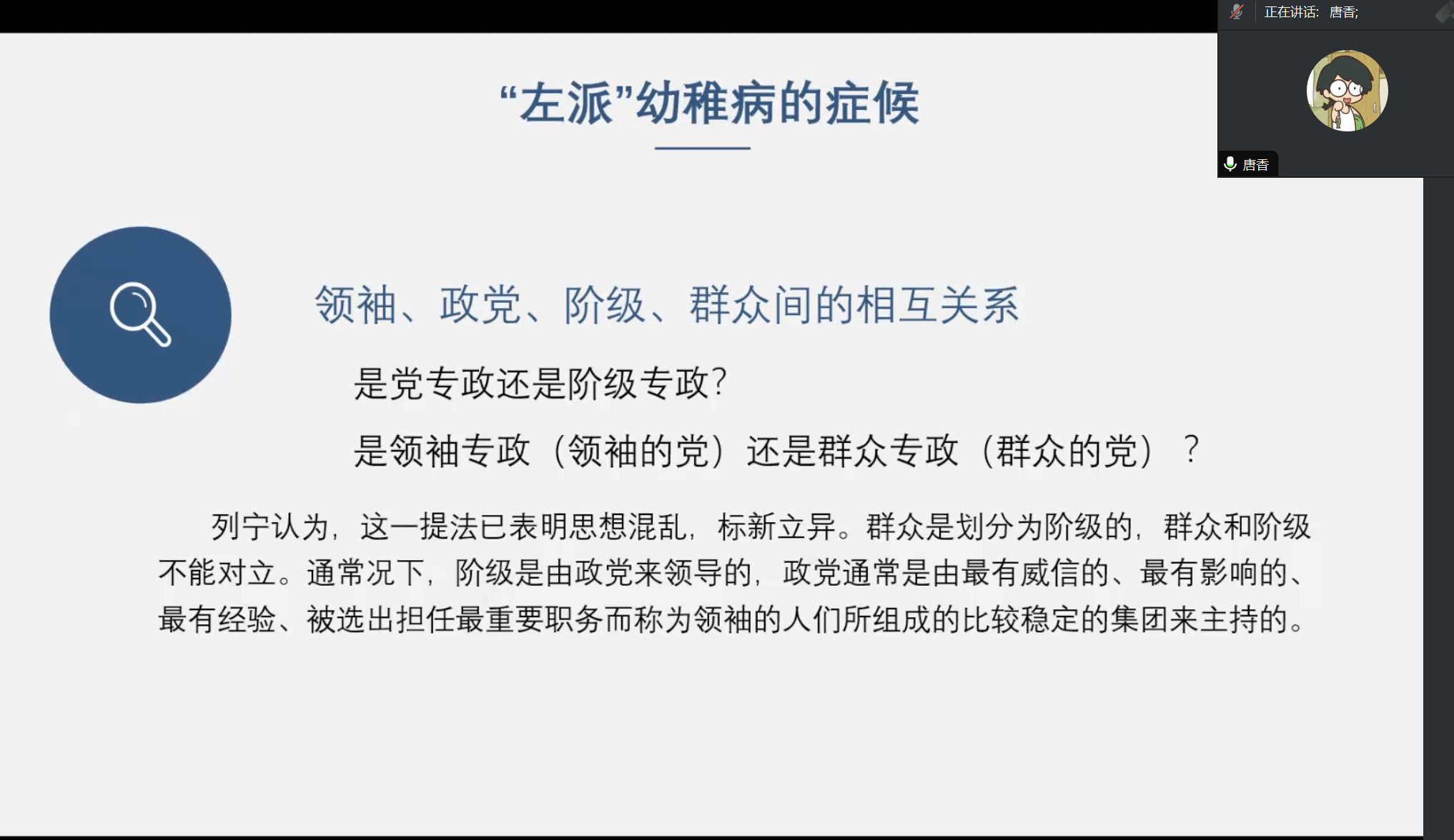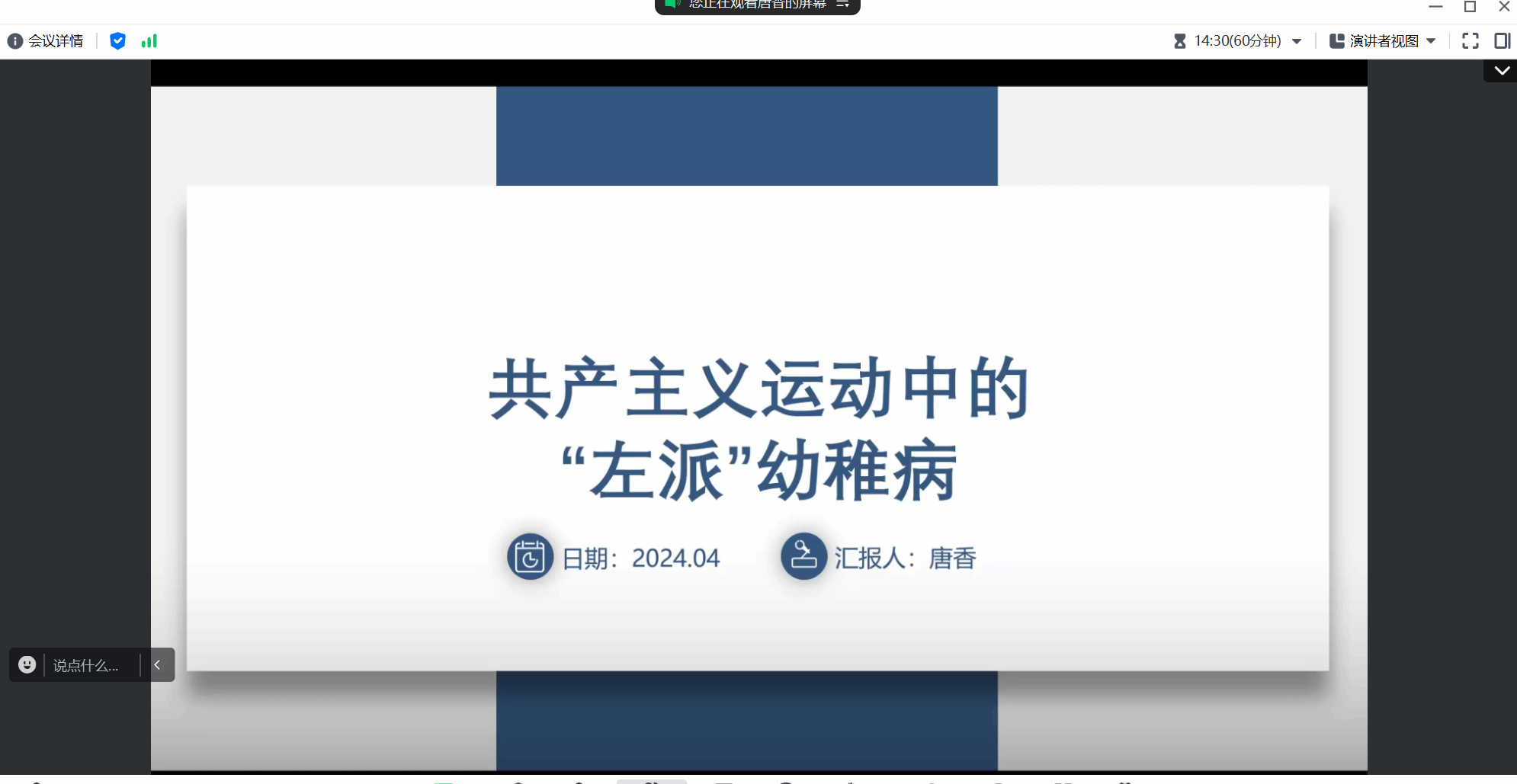 最后,唐老师讲述了对于该著作内容的感悟与体会。我们深感列宁对于共产主义运动的深刻理解和对于策略智慧的独到见解。他对于“左派”共产主义的剖析,不仅帮助我们认清了其根源和危害,也为我们提供了避免重蹈覆辙的警示,直到今天,列宁的这些原则和策略仍然具有重要的指导意义。