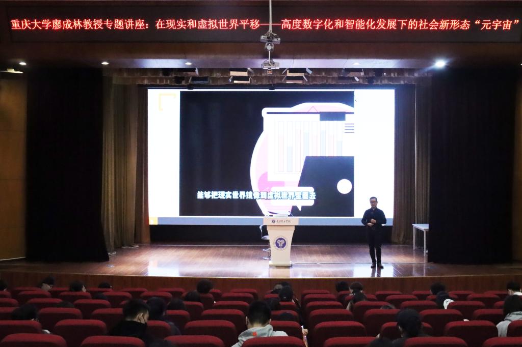 随后,廖成林教授为我们讲述了“元宇宙”居民的一天。他们的生活日常里充溢着AI,AR,VR的无限可能性,若赛博朋克,散发着无限魅力。在“元宇宙”中,我们可以远程会议,远程了解自己想要了解的一切,远程感受家庭的温馨,还可以体验自己期望人生。在“元宇宙”的奇幻笼罩下,我们的未来将会变成常态化“惊喜”的美好未来,这时,一个新的概念——MR(混合现实)便出现了。“元宇宙”,既有现实的干脆,又有虚拟的梦幻。
