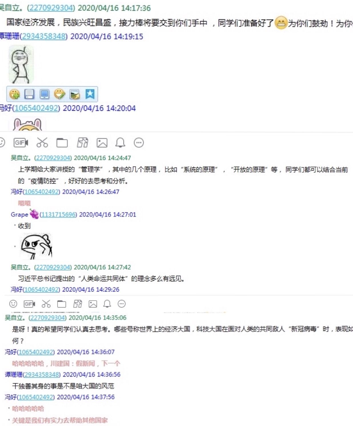 4月11日—4月19日,吴自立老师多次与我校钓鱼城城市化战略研究院研究生班的学生进行视频连线,结合全球“疫情防控”“人类命运共同体”“新冠病毒疫情面前的中国担当”等内容展开讨论,开启学生们的智慧,提高学生们的思辨能力,并且指导学生的论文选题。同学们都踊跃参与互动,气氛热烈,反响很好。