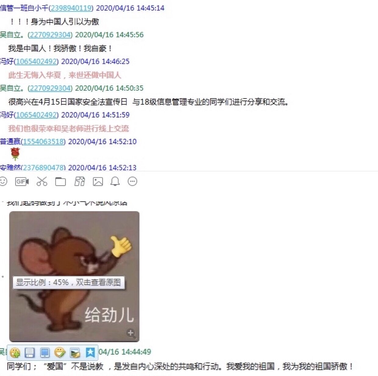 爱国,维护国家安全是“完满教育”最为重要的内容。2020年4月15日是第5个全民国家安全教育日,为进一步做好学院安全保密教育工作,增强师生国家安全保密意识,4月16日,吴自立老师参加了2018级信息管理与信息系统“师生同上一堂国家安全教育课”的主题活动,与学生共同观看CCTV-12社会与法频道节目,并且就安全问题进行了分享与交流。吴自立老师认为,爱国不是“说教”,是发自内心深处的共鸣和行动。国家安全涉及到方方面面,包括我们的海洋、陆地、山川、湖泊,其实都涉及到我们的战略资源,我们必须重视总体国家安全。既包括政治、军事等传统安全,又重视经济文化、社会科技、生物、网络等非传统安全问题。维护网络安全,不是停留在嘴上的,也不是停留在法律条文上的,它是实实在在的。不要认为我们好像离国家安全很远,认为那都是国家安全机关的事儿,是政府的事儿,维护国家安全,每个人都有不可推卸的一份责任和义务!同学们积极参与互动,其中冯好同学说,“维护国家安全,每个人都有不可推卸的责任和义务,维护国家安全需要每一个公民的积极参与!国家安全是头等大事,没有国家安全,经济发展、社会进步、人民幸福都无从谈起。”