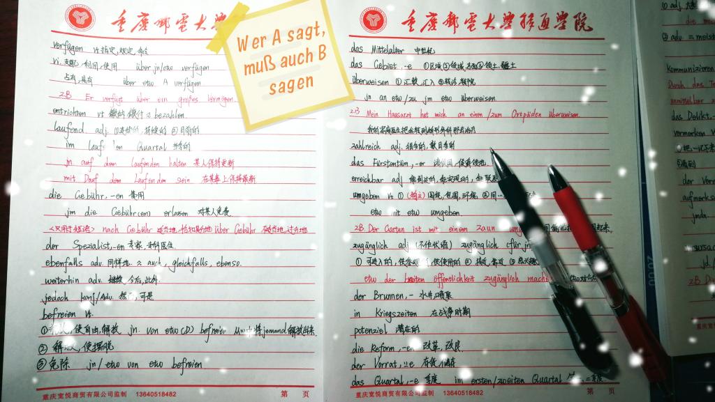 自上周我院德语教研室组织开展“线上德语课学习笔记展示交流活动”后,在中德学院学子中掀起了勤记笔记的热潮,我们又陆续收到了多个优秀笔记作品。
