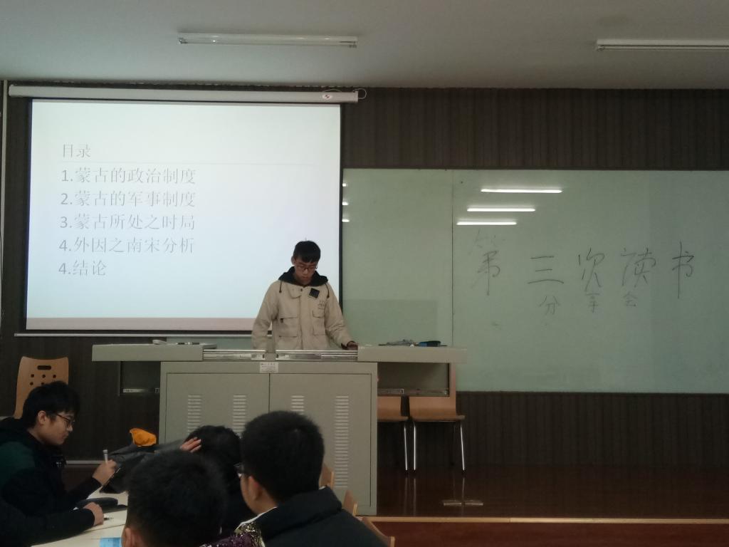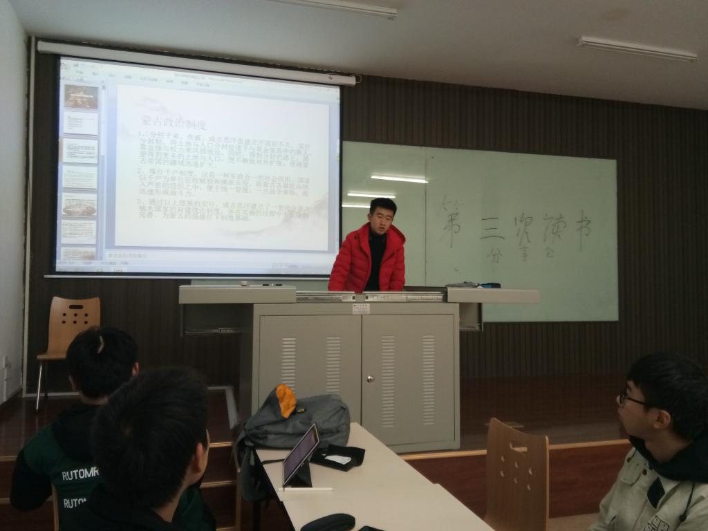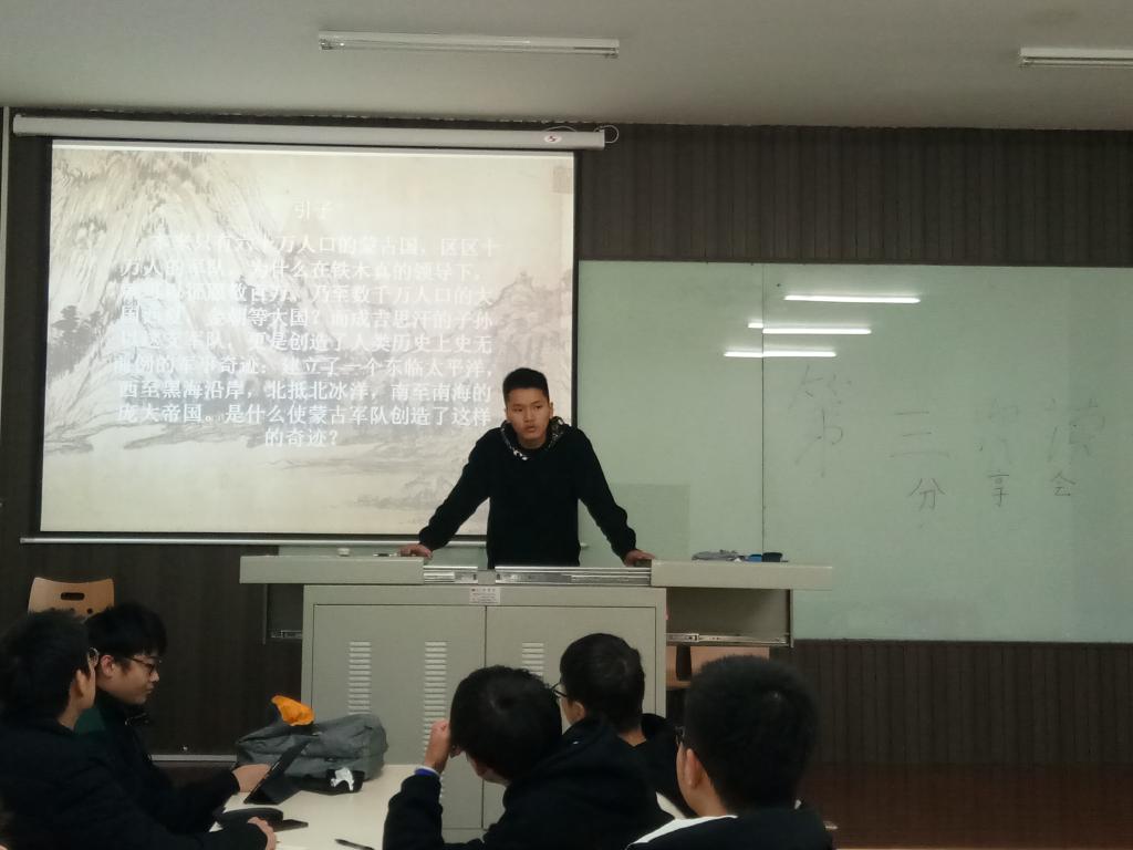 本次读书分享会共有两个小组进行了分享。第一组由石小龙同学为代表上台进行的分享,他主要从蒙古的学习能力、政治局势、军队的战斗能力以及领导者的个人能力等等方面进行了独特的分析。